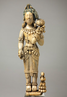 this figure depicts the Bodhisattva Padmapani Lokeshvara. Ht. 33 cm. Cleveland Museums. This ivory shows traces of polychrome on the hair. It was made in the province of Yunnan, which is close to Nepal. The subject as well as the carving style is clearly influenced by Nepal art. This is a very interesting figure. Its face is relatively "fat", which accords with the aesthetic of Tang dynasty. Its thin body as well as the decorations is close to Nepalese art style.